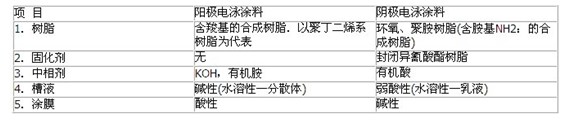 (2)陰極電泳涂料:陰極電泳涂料用的成膜聚合物是陽離子型樹脂,在樹脂骨架中含有多數的胺基.中和劑為有機酸,如甲酸、乙酸、乳酸等.陰極電泳涂料在水中離解成為陽離子的聚.合物,最常用的村脂有環氧樹脂和聚胺酯等.陽極電泳涂料和陰極電泳涂料組成的比較見下表.