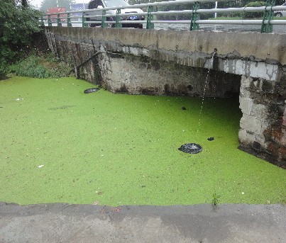在當地大壩頭村村民的帶領下,記者找到了路家浜,這是一個斷頭浜,東頭連著永安河,在路家橋下還剩著幾根筑壩的鋼管,整個河面上漂浮著綠萍,只能依稀看到河水的顏色有些微黑。而在路家橋東頭,河水要比斷頭浜一側要清亮些。