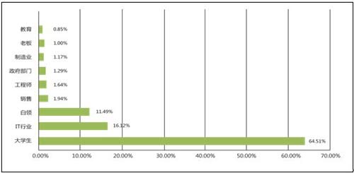 根據(jù)一份2012年的微信用戶屬性數(shù)據(jù)顯示,微信用戶中男性占了63%,而從年齡分布來看20-30歲之間的青年占了74%。目前,微信用戶群具有年輕化、男性居多的特征,從職業(yè)分布來看,擁有大量碎片時(shí)間的大學(xué)生是主體。大學(xué)生占了64%,其次是IT行業(yè)和白領(lǐng),這三類人占了微信用戶總數(shù)的90%。